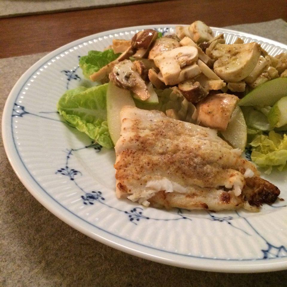 Ovnbagt torsk med sennep og svampe-/pæresalat